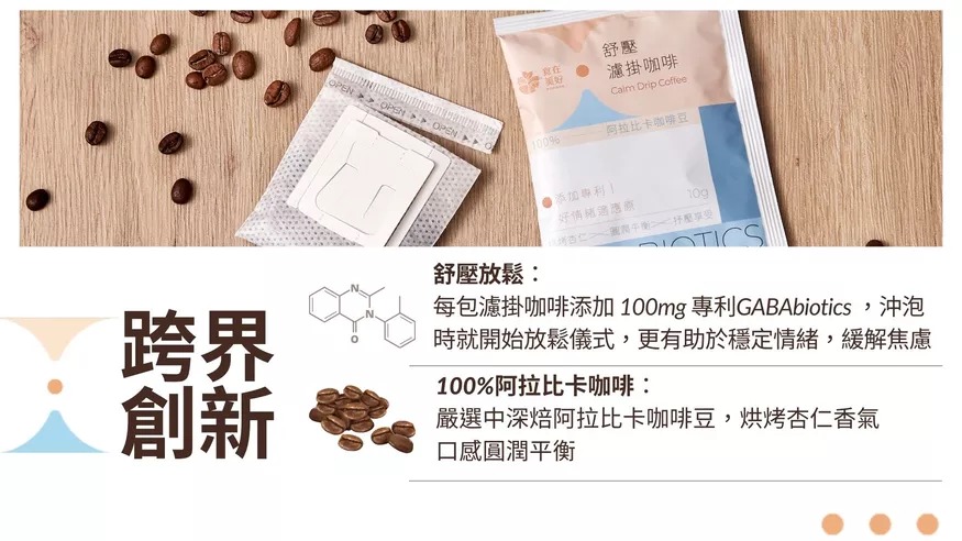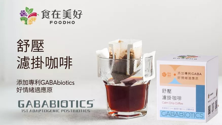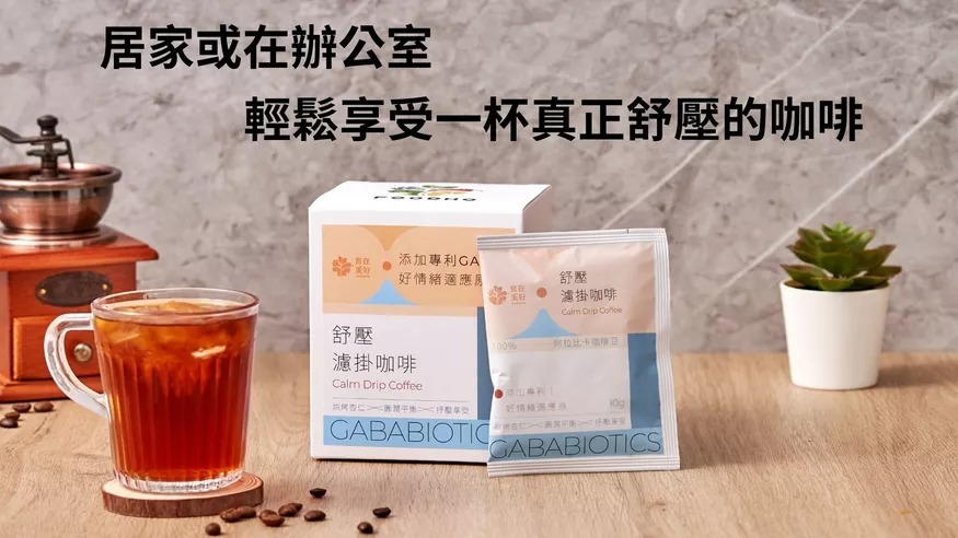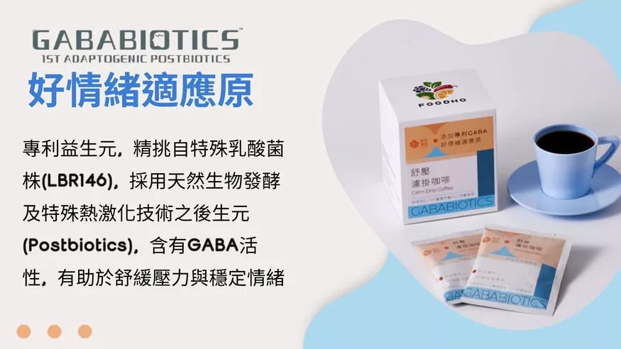 GABA濾掛咖啡添加專利研發的「GABABIOTICS好情緒適應原」,其精挑自特殊乳酸菌株(LBR146),採用天然生物發酵及特殊熱激化技術之後生元,含有GABA活性,有助於舒緩壓力與穩定情緒。