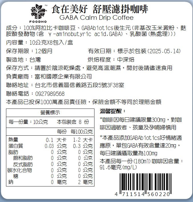 5. 成分:100%阿拉比卡咖啡豆、GABAbiotics後生元(非基改玉米澱粉、麩胺酸發酵物(含 γ-aminobutyric acid,GABA)、乳酸菌(熱處理))