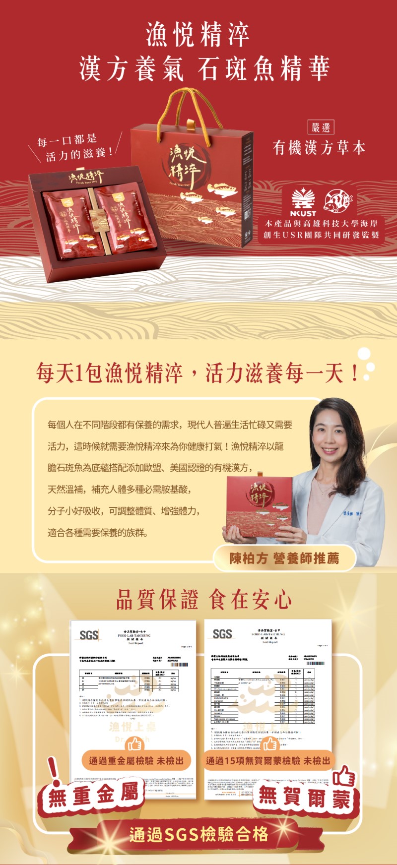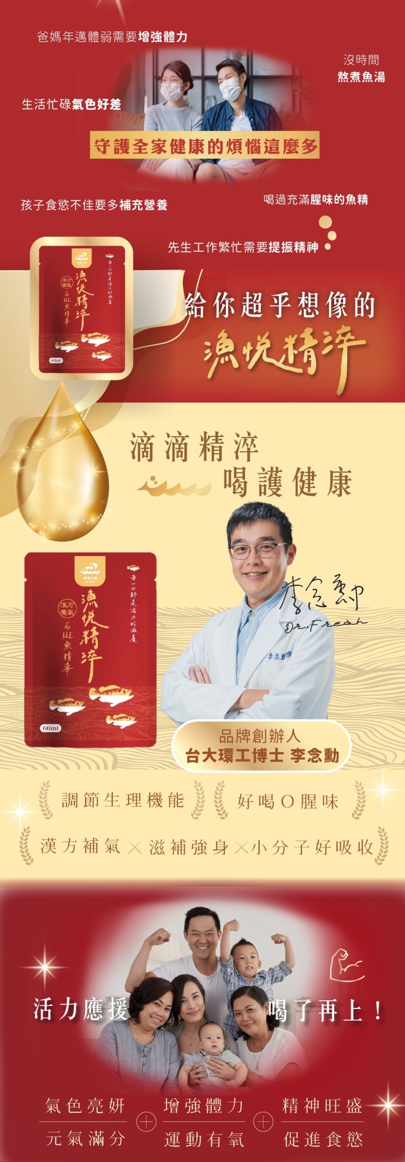 長輩是否經常感到疲憊無力,或因食慾不佳無法攝取足夠營養?【漁悅精淬】石斑魚精華,滴滴精淬,分子小好吸收,可調整體質,增強體力,適合各種需要保養的族群!