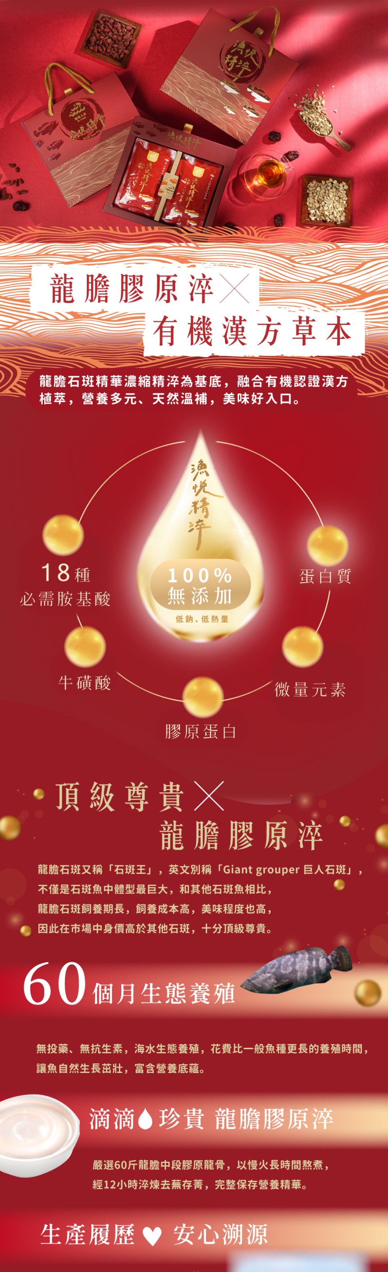 3. 成分:漢方萃取液(水、枸杞、紅棗、黃耆、當歸)、龍膽膠原萃(水、龍膽石斑)。