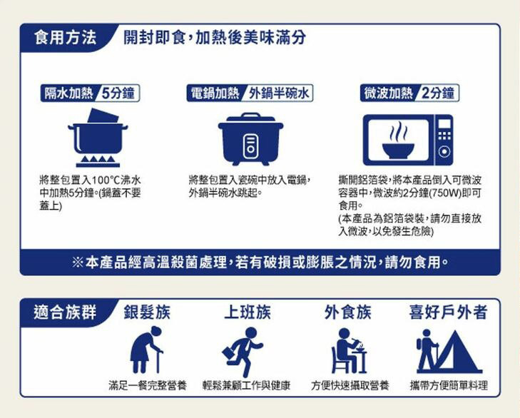 3. 微波加熱:撕開鋁箔袋,將本產品倒入可微波容器中,微波約2分鐘(750W)即可食用。
