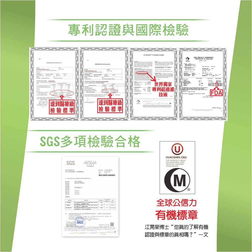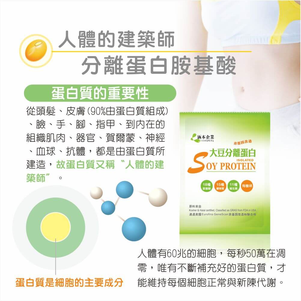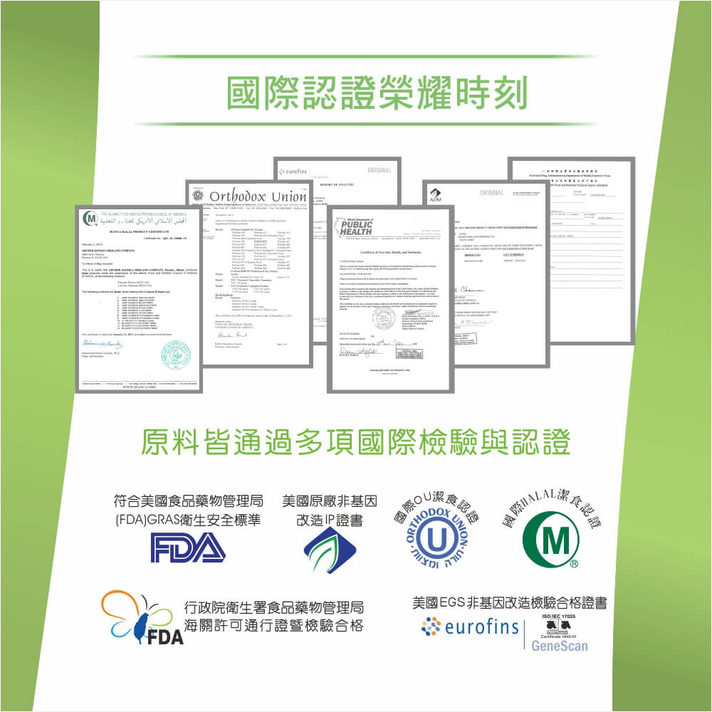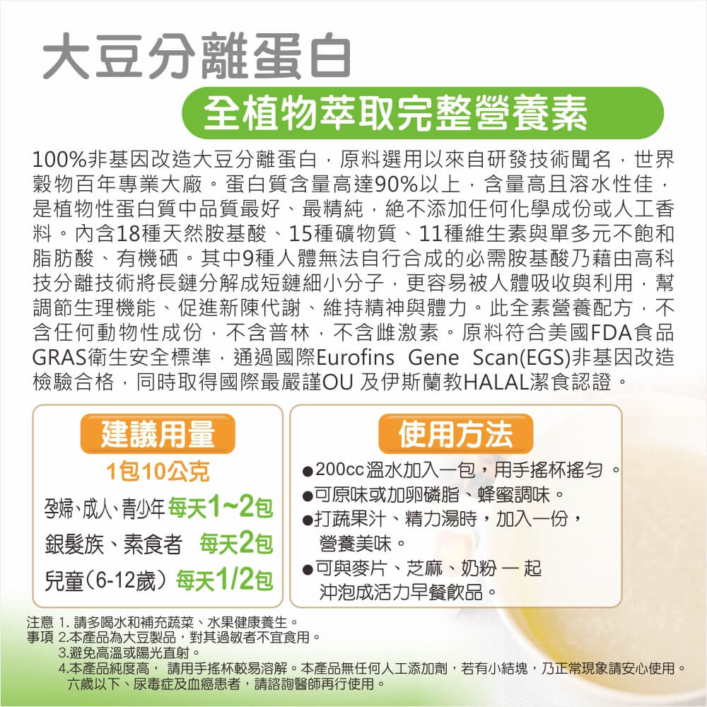 本公司原料保證美國原廠原貨,絶不添加任何化學成份或人工香料,其所含人體所需胺基酸數量高達18種且含多種人體所需礦物質。其中9種人體無法自行合成的必需胺基酸乃藉由高科技分離技術將長鏈分解成短鏈,更容易被人體吸收與利用。原料通過國際Eurofins Gene Scan(EGS)非檢驗合格,同時取得國際最嚴謹OU kosher潔食認證及伊斯蘭教的HALAL潔食認證。其品質、技術堪稱世界之首,暢銷歐、美多年。與卵磷脂、維生素並列世界三大營養品。目前在市場上較常見的濃缩大豆蛋白( concentrate soy protein )或大豆蛋白粉( soy flour ),乳清蛋白,吸收只能達到30%-60%。