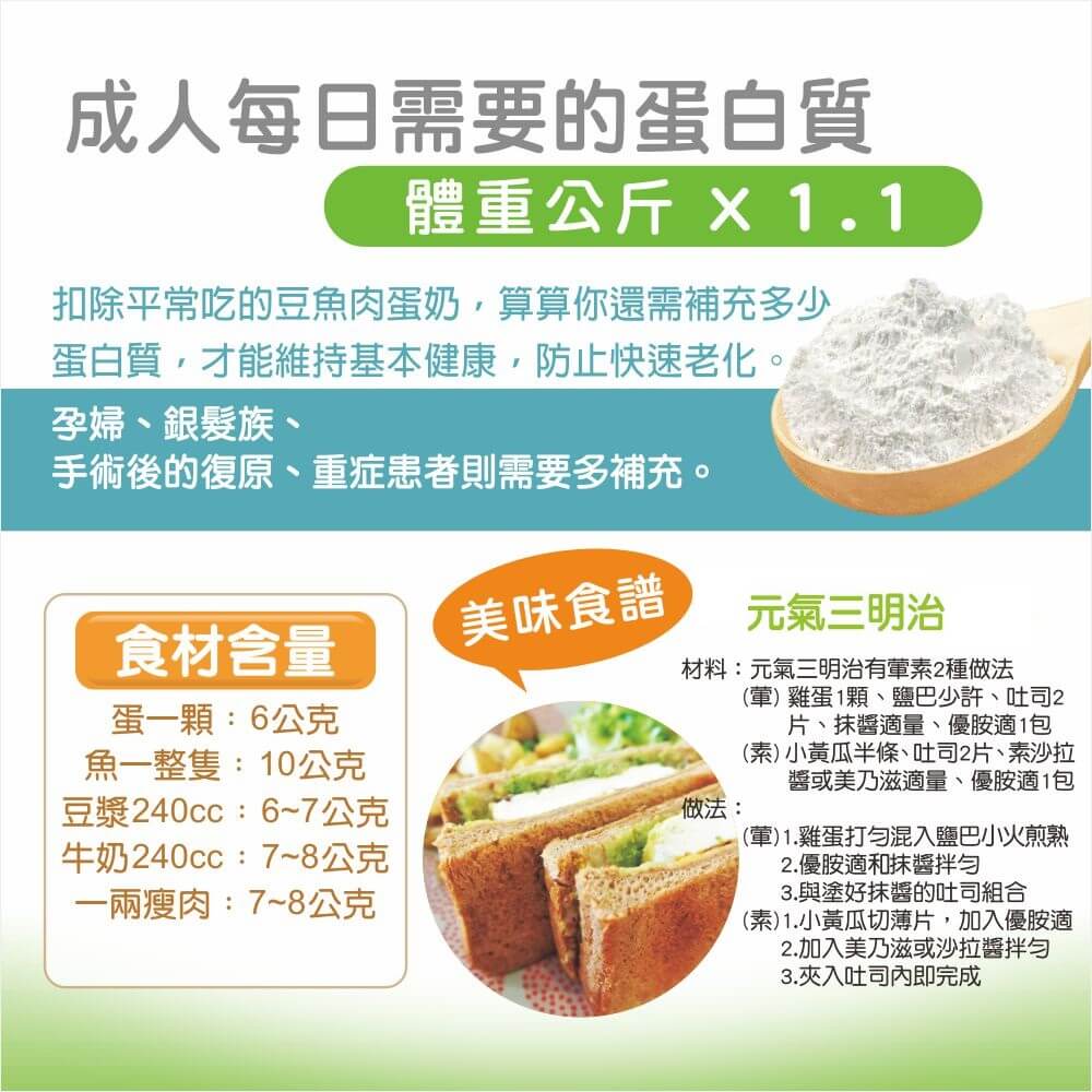 成人每日需要的蛋白質=體重公斤*1.1公克蛋白質