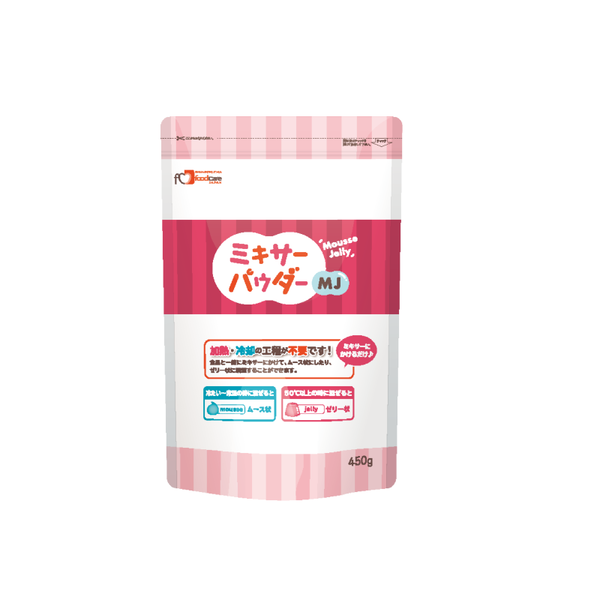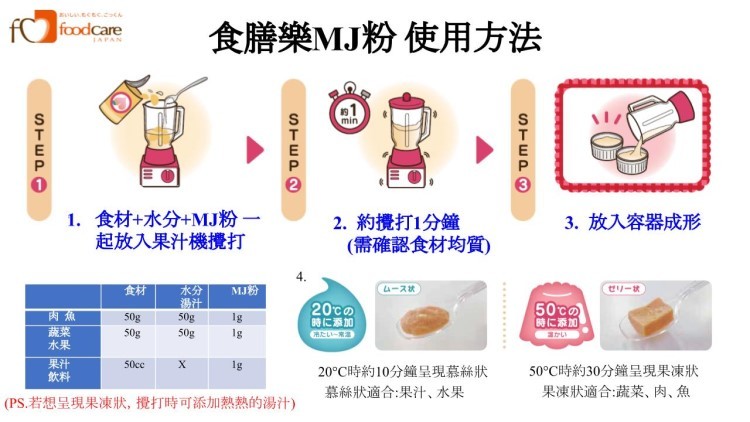 試試看日本【食膳樂】MJ粉,只要將食材加水,與MJ粉一起放入果汁機攪打後,放入容器成形,就成了慕斯果凍餐,作法簡單好吞食,適用肉、菜、水果等食材。