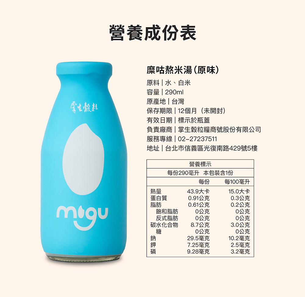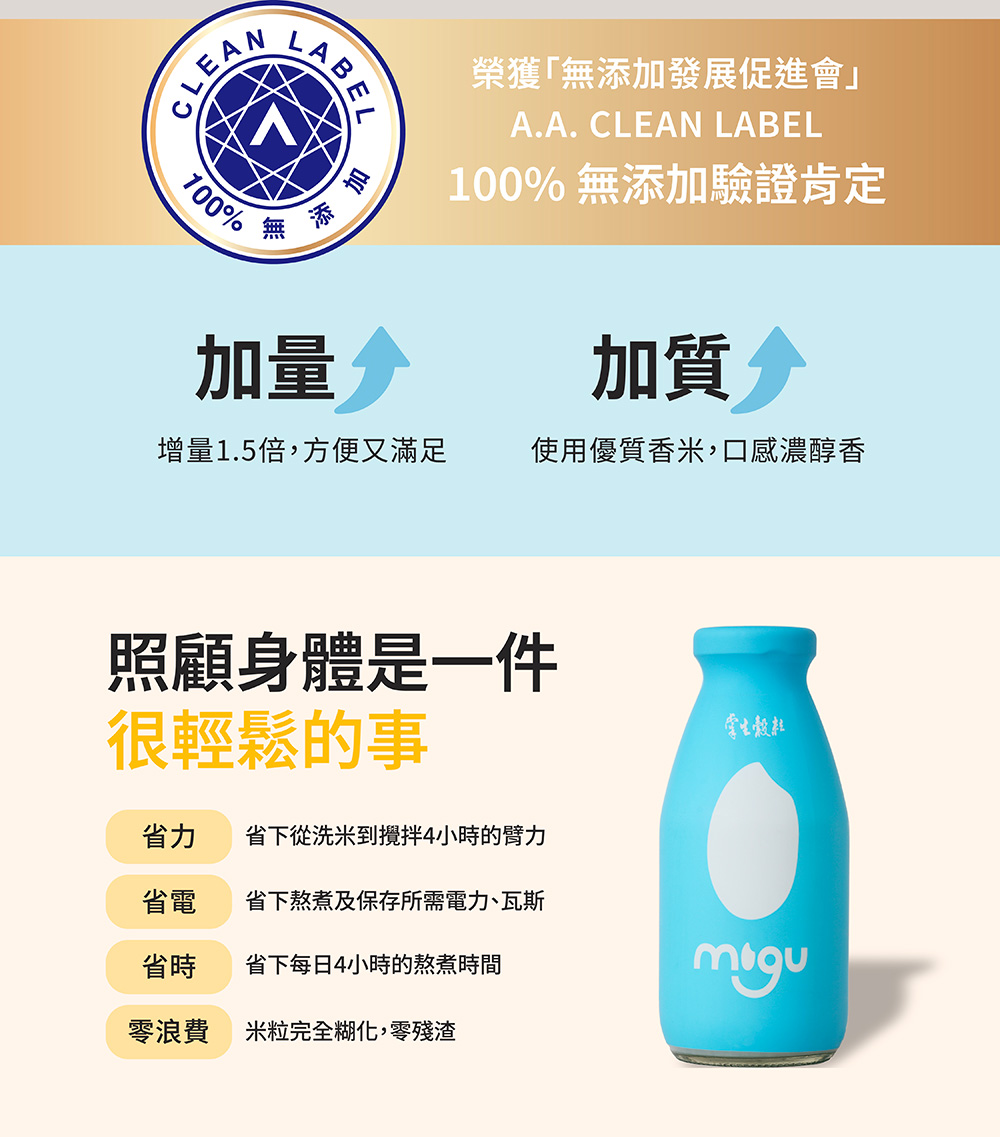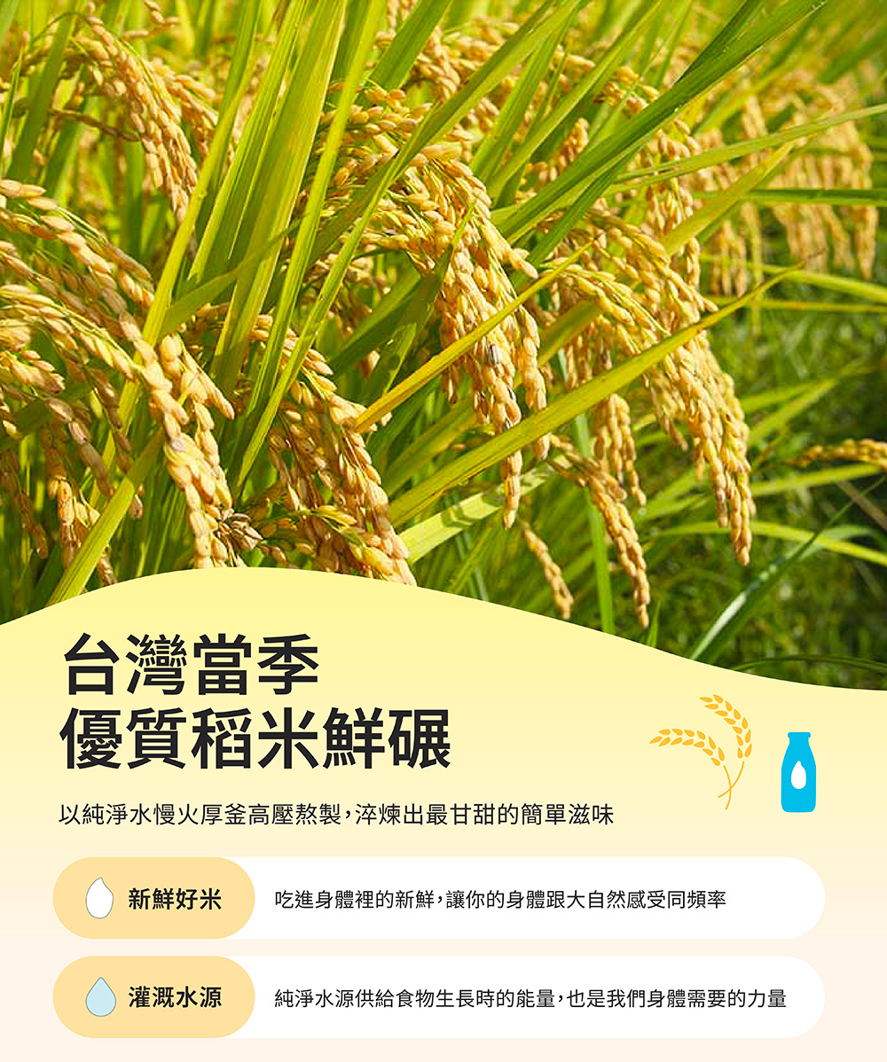 2. - 單純配方:為您打包最純淨的米、水、與寶貴的熬煮時間。白米來自台東關山,碾米廠擁有 ISO22000 食安衛生驗證,專心碾製每一粒好米,絕不混充