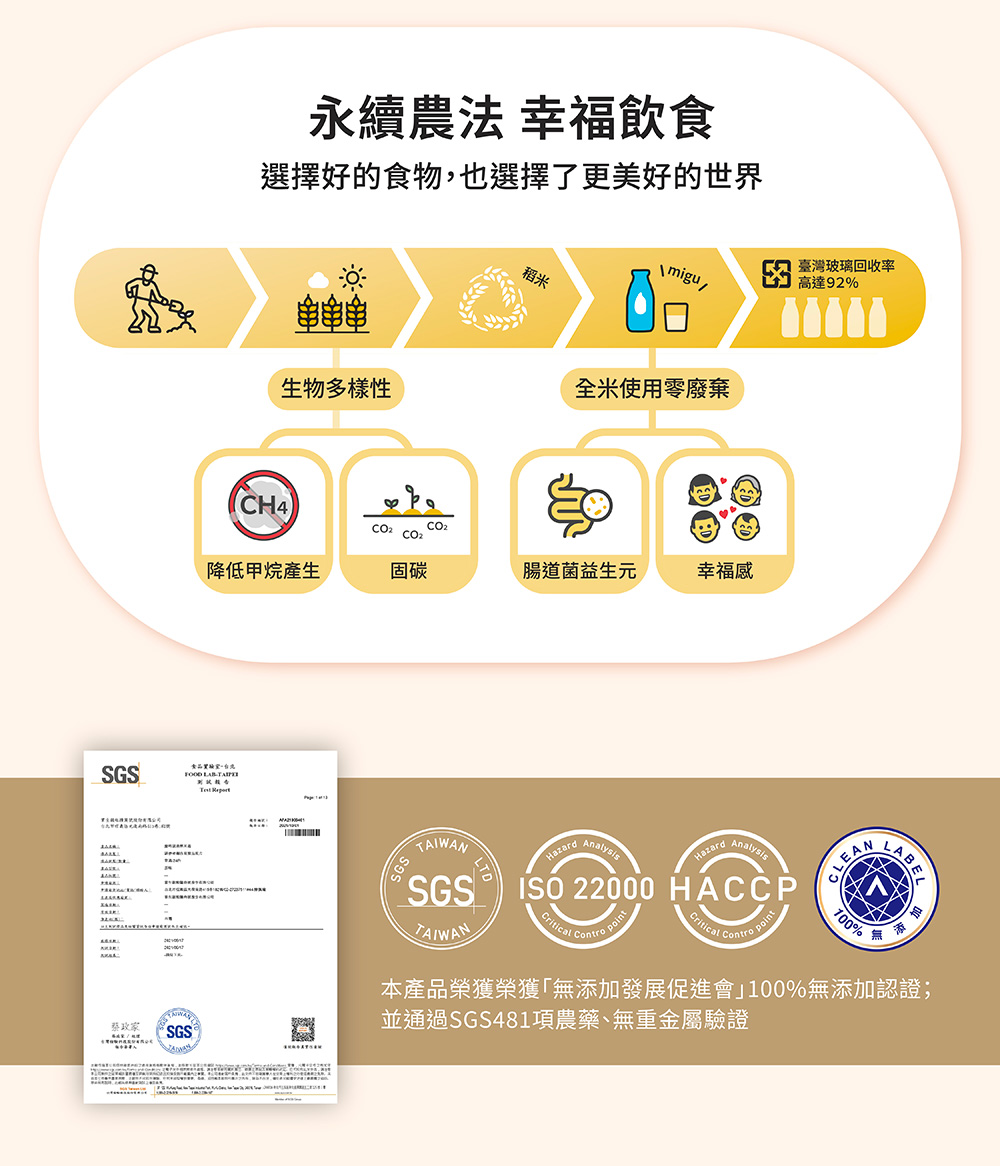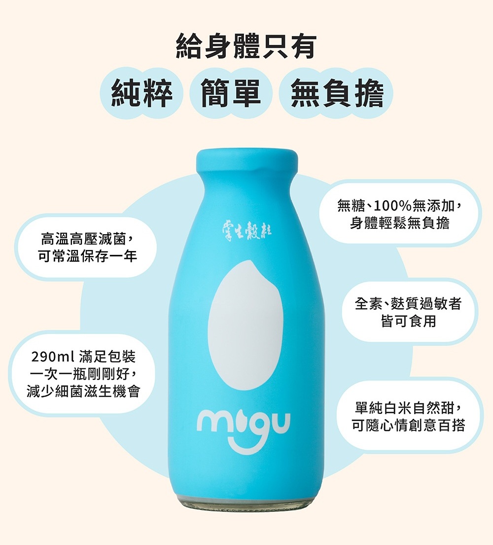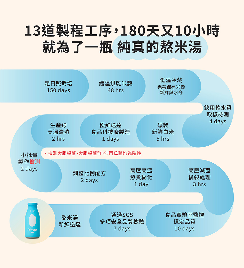 2. - 單純配方:為您打包最純淨的米、水、與寶貴的熬煮時間。白米來自台東關山,碾米廠擁有 ISO22000 食安衛生驗證,專心碾製每一粒好米,絕不混充