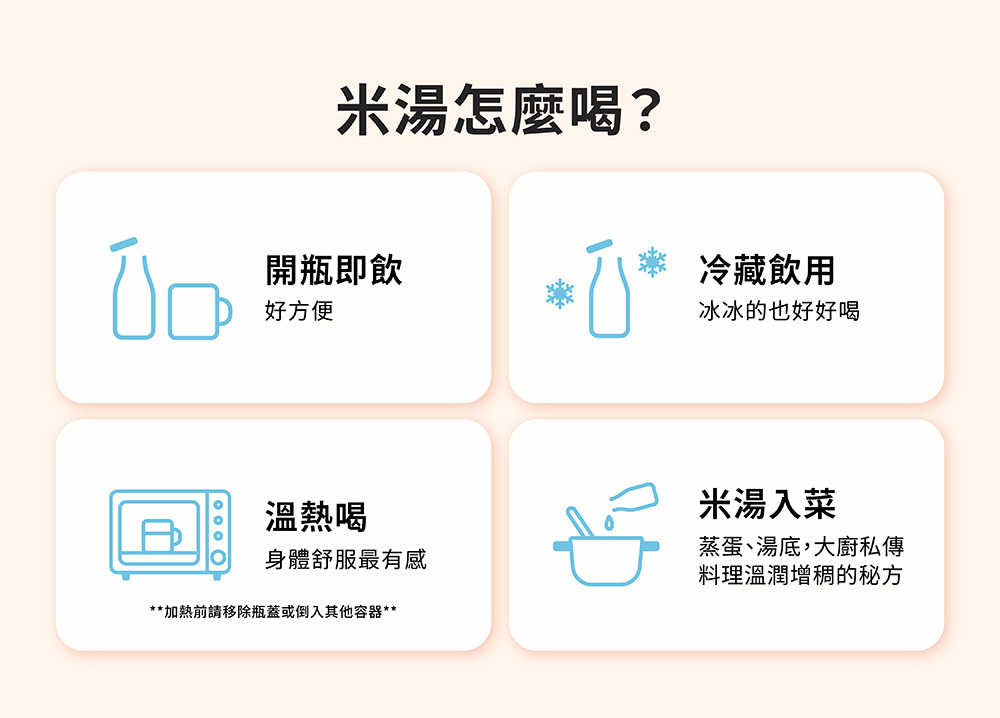 5. - 建議完美暖和胃腸的飲用技巧,空腹時緩緩飲用溫熱熬米湯,且30分鐘以後再進食,舒服的感覺您自己的身體最清楚