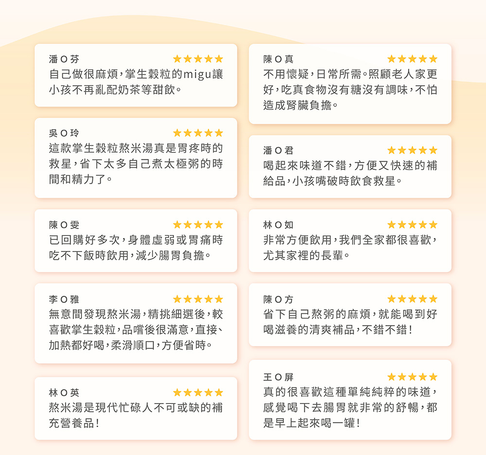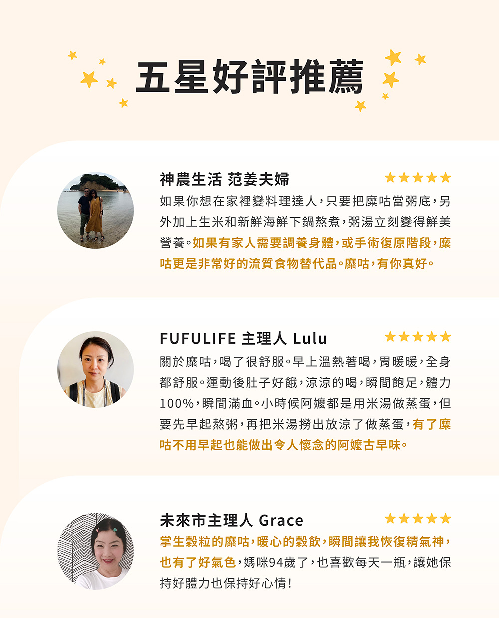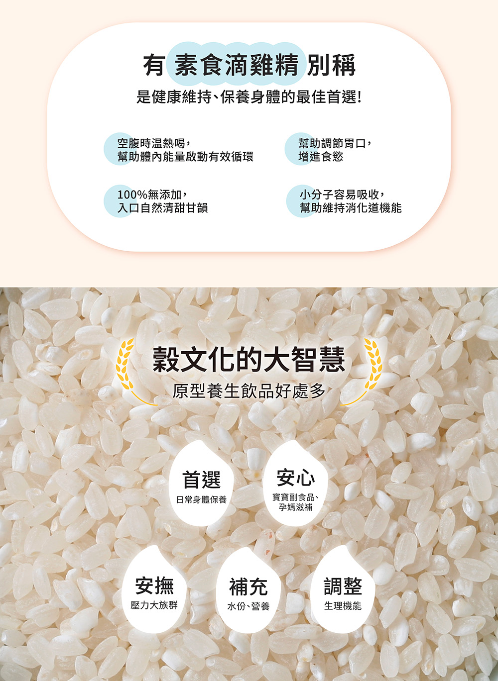 1. 是否擔心長輩因牙口不佳或消化不良,無法攝取足夠營養?【掌生穀粒】糜咕熬米湯,專為銀髮族設計,選用優質糙米細火慢熬,口感滑順細膩,容易入口、好吸收,給長輩最溫和的營養補給。米湯富含豐富的維生素與礦物質,不僅幫助消化,更能增強體力,讓身體更有抵抗力。無論是早餐、點心或輕食,這款米湯都是長輩理想的日常營養選擇,為他們的健康保駕護航。