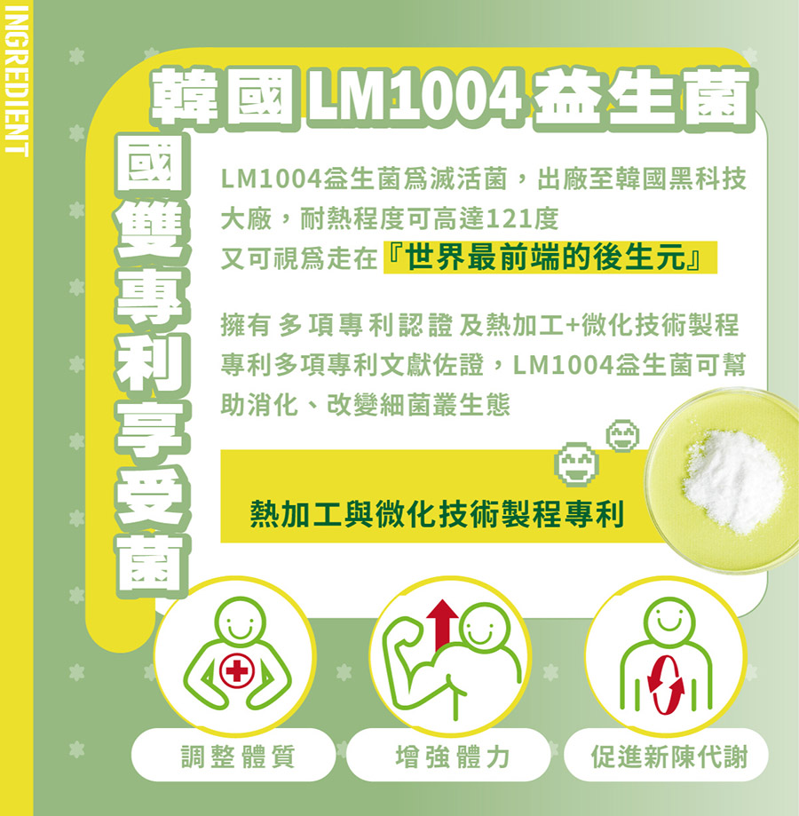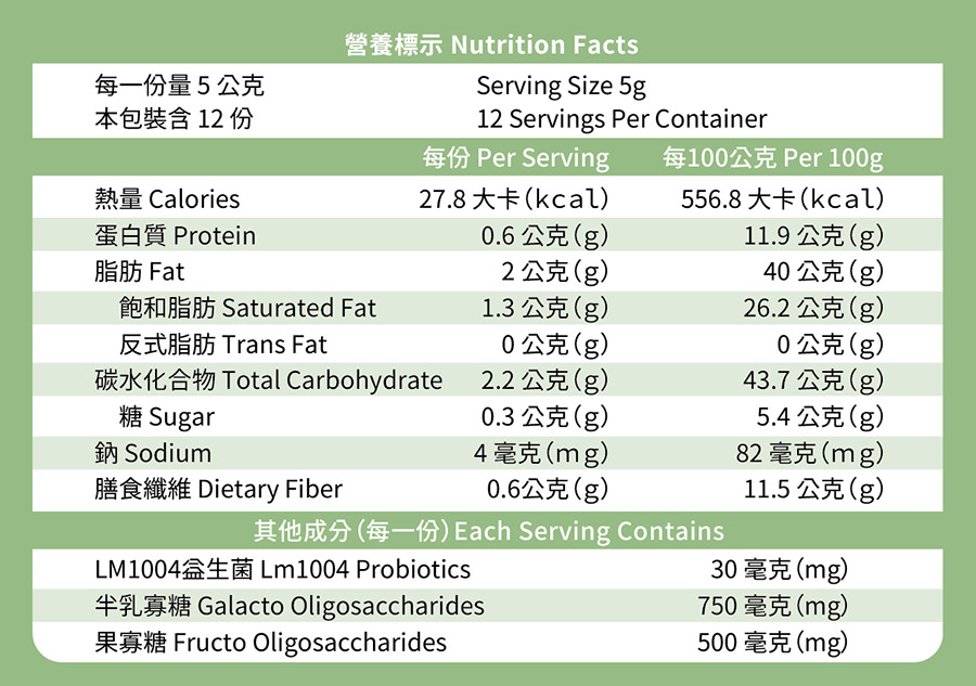 | LM1004益生菌 | 0.6公克 | 30毫克 |