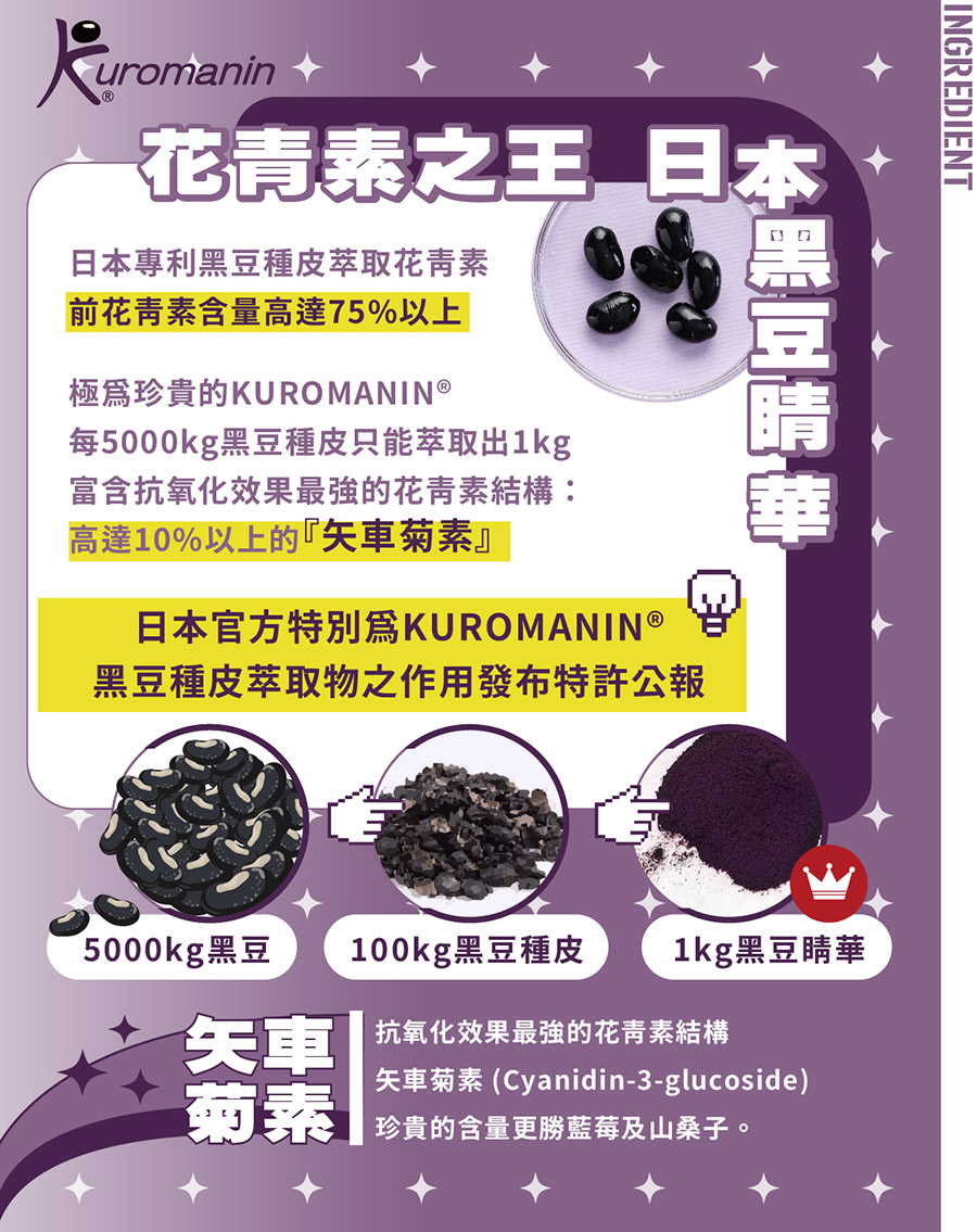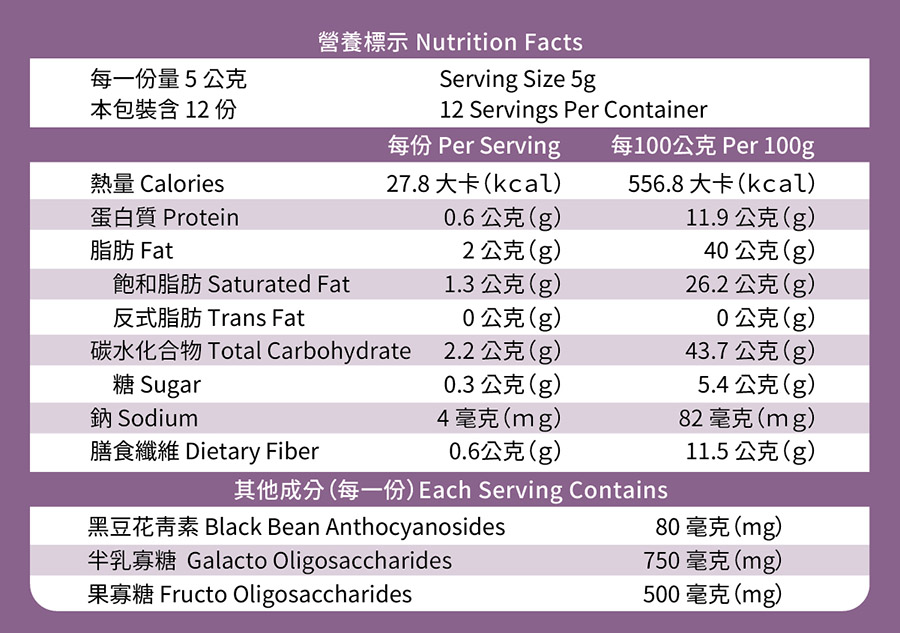 | 黑豆花青素 | 0.6公克 | 80毫克 |