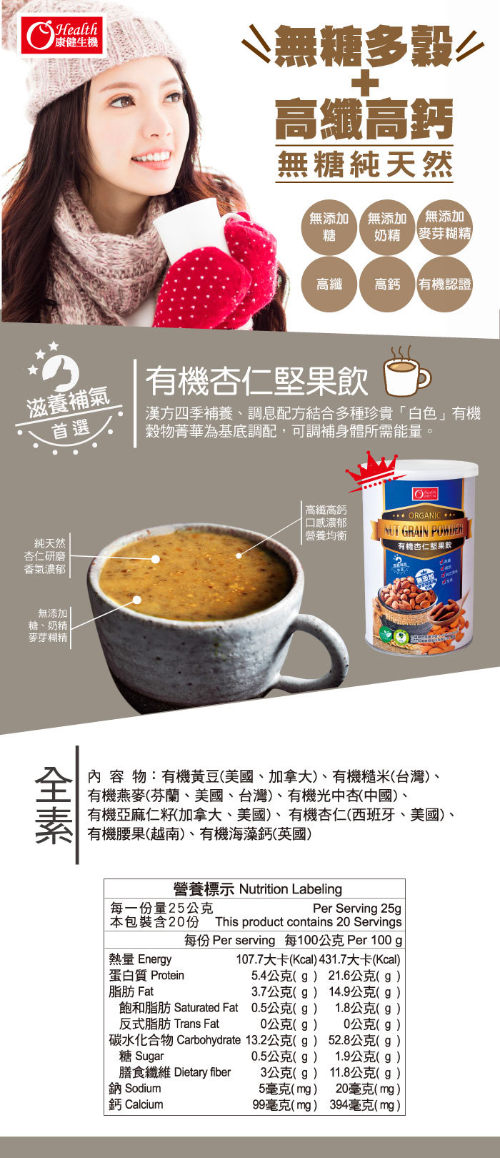 【康健生機】有機杏仁堅果粉,以漢方四季補養、調息配方結合多種珍貴「白色」有機穀物菁華為基底調配,可調補身體所需能量。