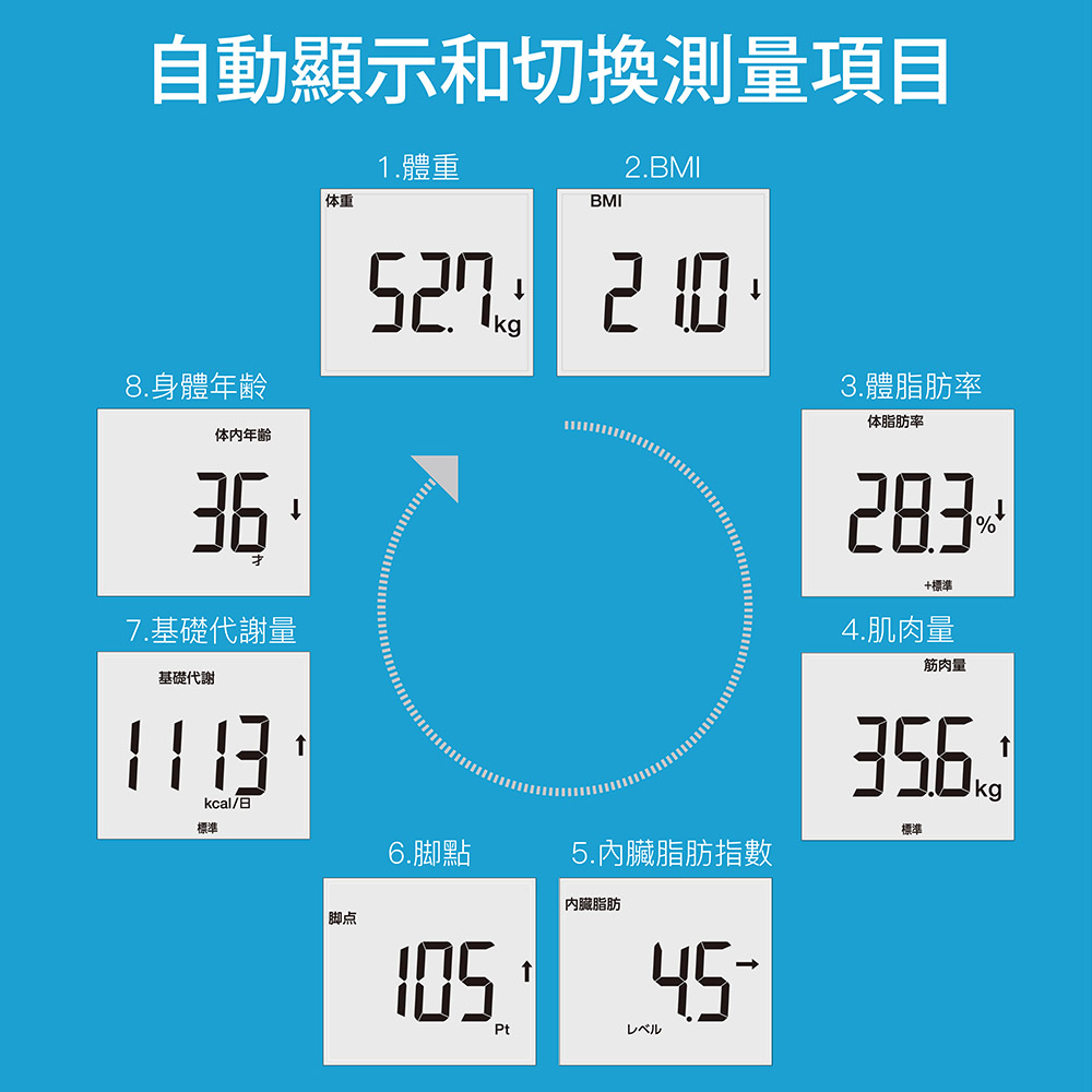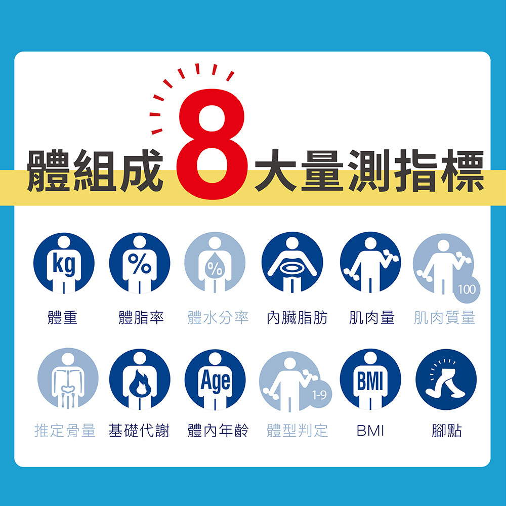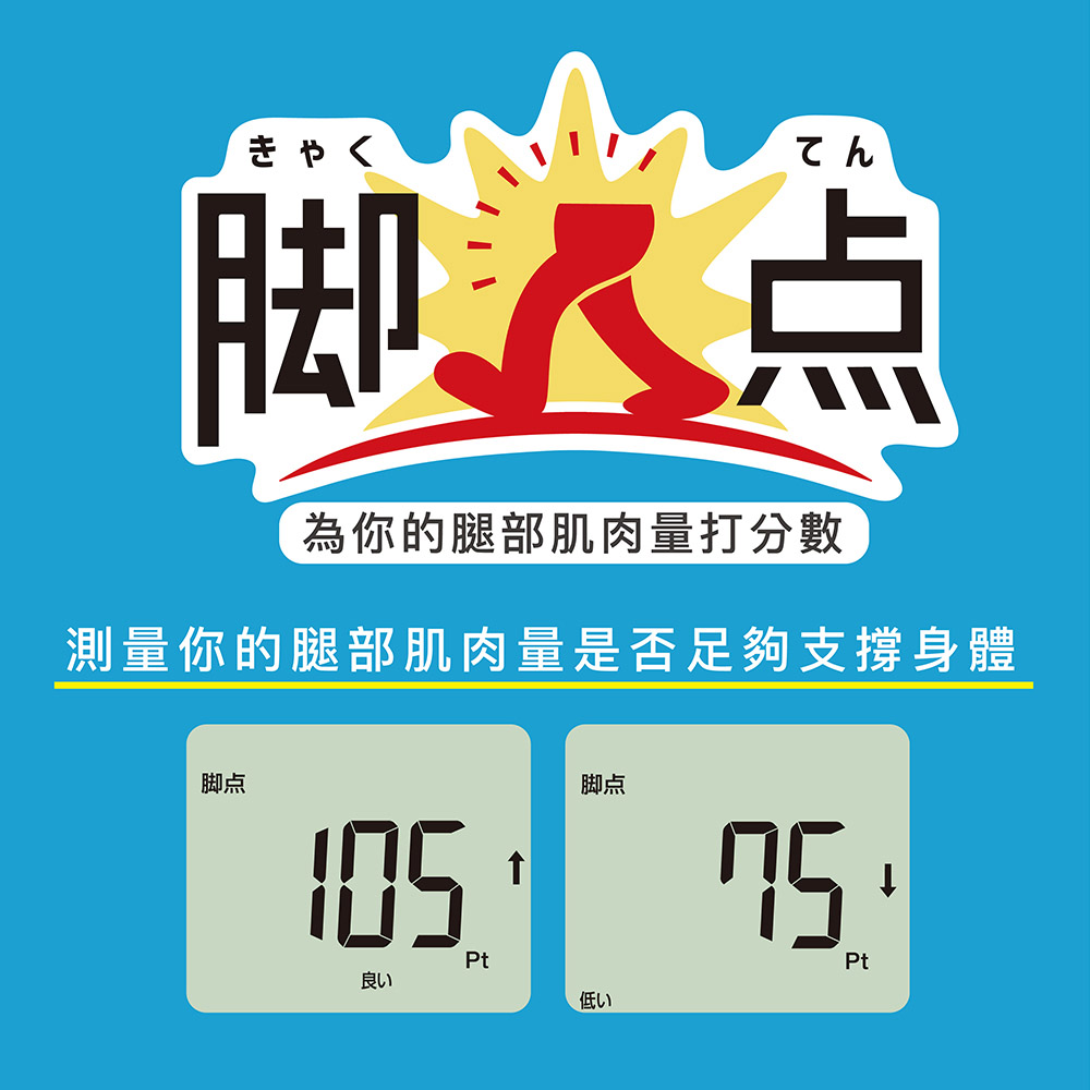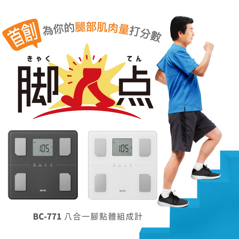 年齡增長後,體重數字已不夠完整反映健康狀態,體脂肪、肌肉量、基礎代謝率等更是維持活力的關鍵!【TANITA】八合一腳點 體組成計 BC-771,透過腳點測量技術,站上去即可快速檢測體脂肪率、肌肉量、內臟脂肪等數據,幫助您掌握身體變化。簡單操作、大字清晰顯示,讓健康管理變得輕鬆無負擔,陪伴您維持好體力,享受自在熟齡生活!