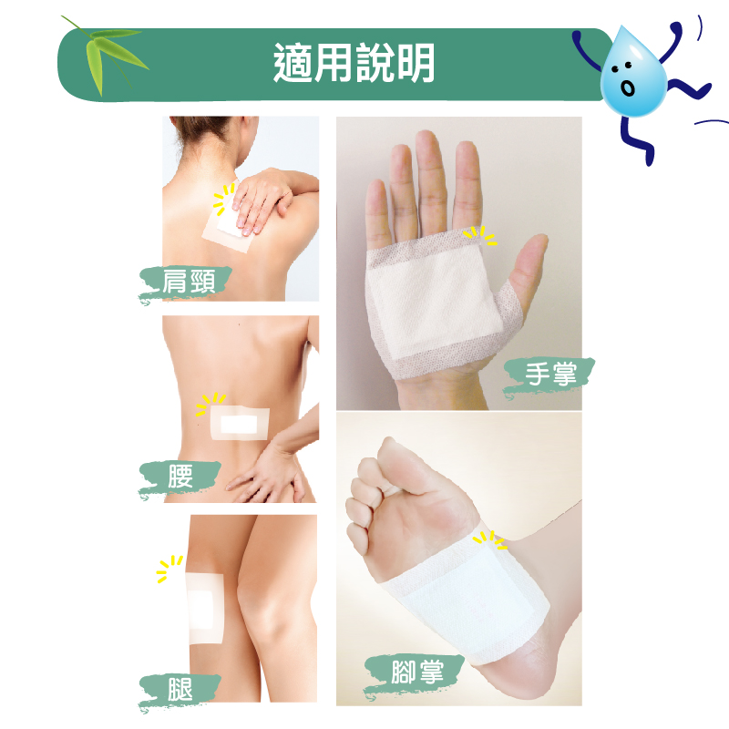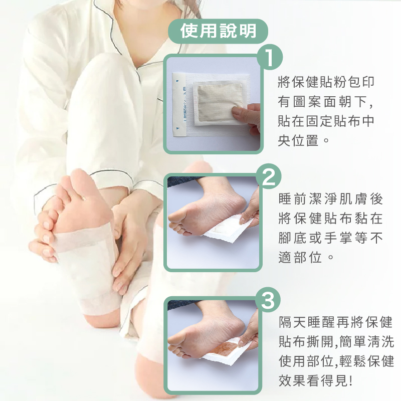 7. 使用方式:(1) 將粉包印字面貼於固定貼布上(置中貼即可),貼於皮膚上即可。