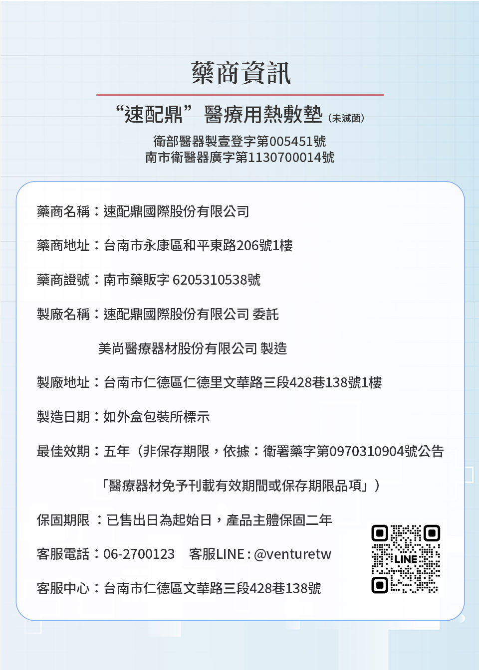 1. 中文品名:"速配鼎"醫療用熱敷墊(未滅菌)