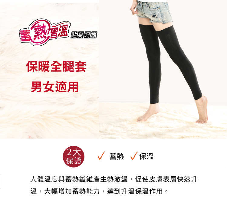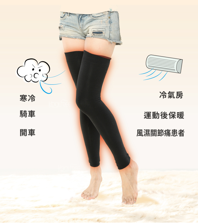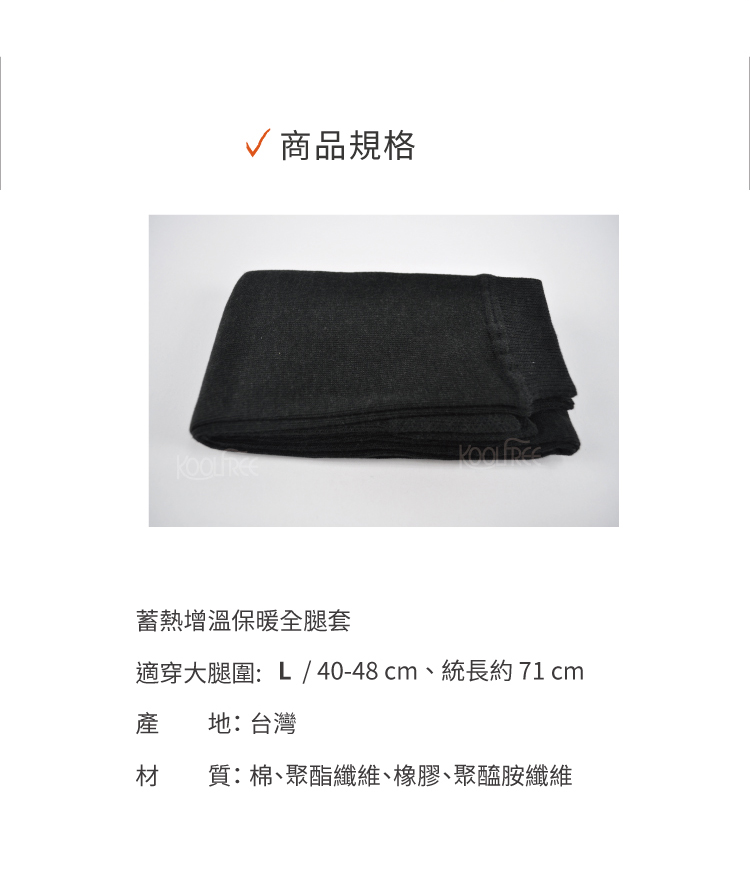 此款【KOOL FREE】蓄熱增溫保暖全腿套,採用竹炭纖維+蓄熱裡層,促使皮膚表層快速增溫蓄熱,直接套上即可使用,是您的居家保暖聖品!