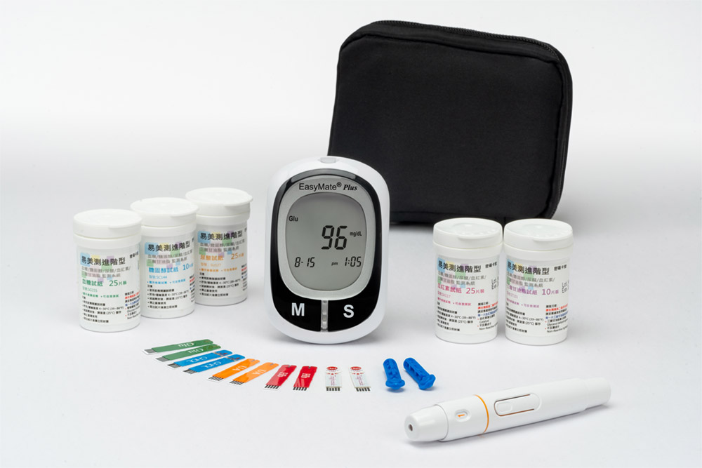 包含測試儀一台、採血筆一支、採血針25支、電池、儀器檢測片、使用說明書、保證卡、收納袋、贈送三酸甘油脂試紙一盒(門市依現場贈品庫存為準)