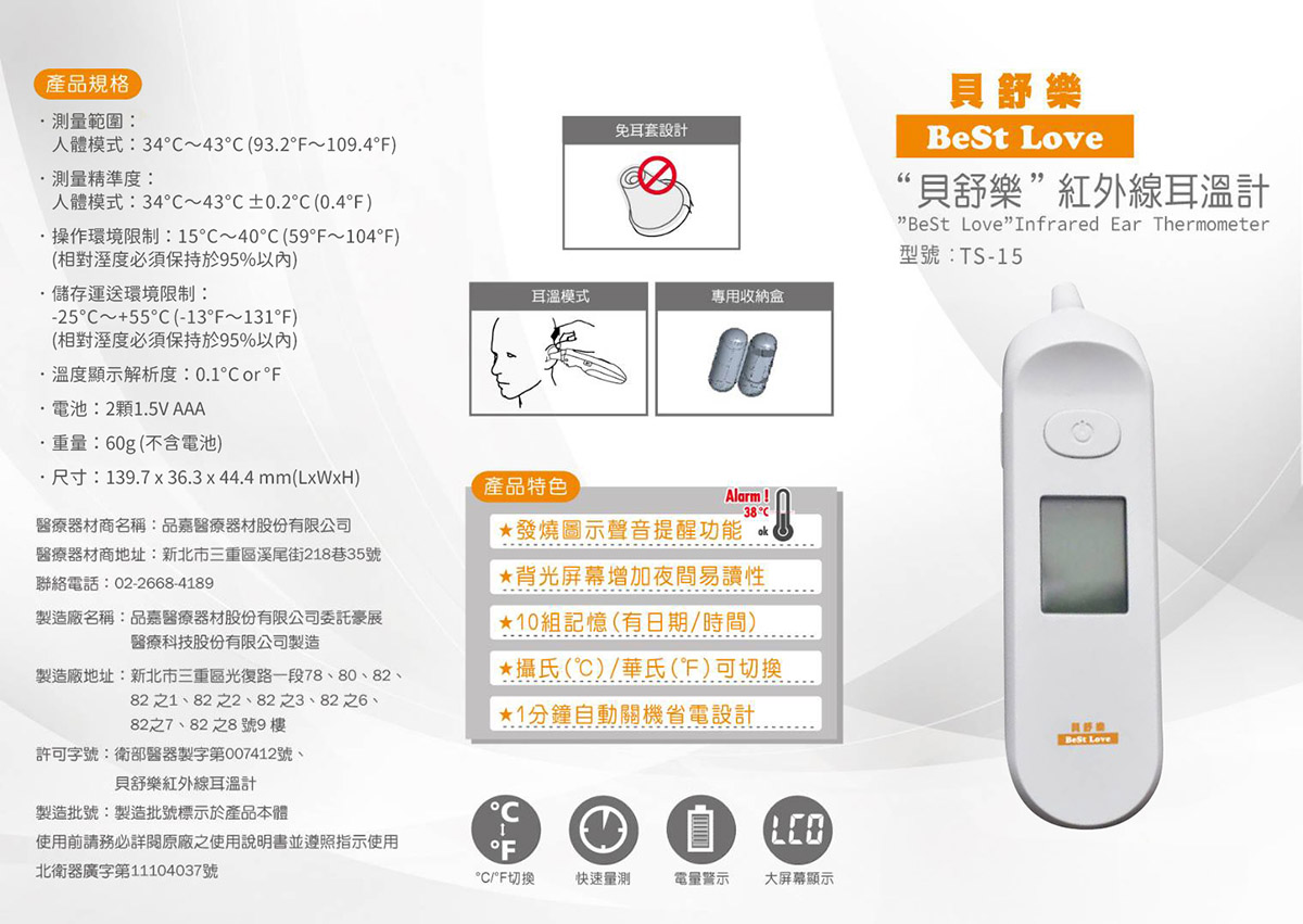 1. 中文品名:“貝舒樂”紅外線耳溫計