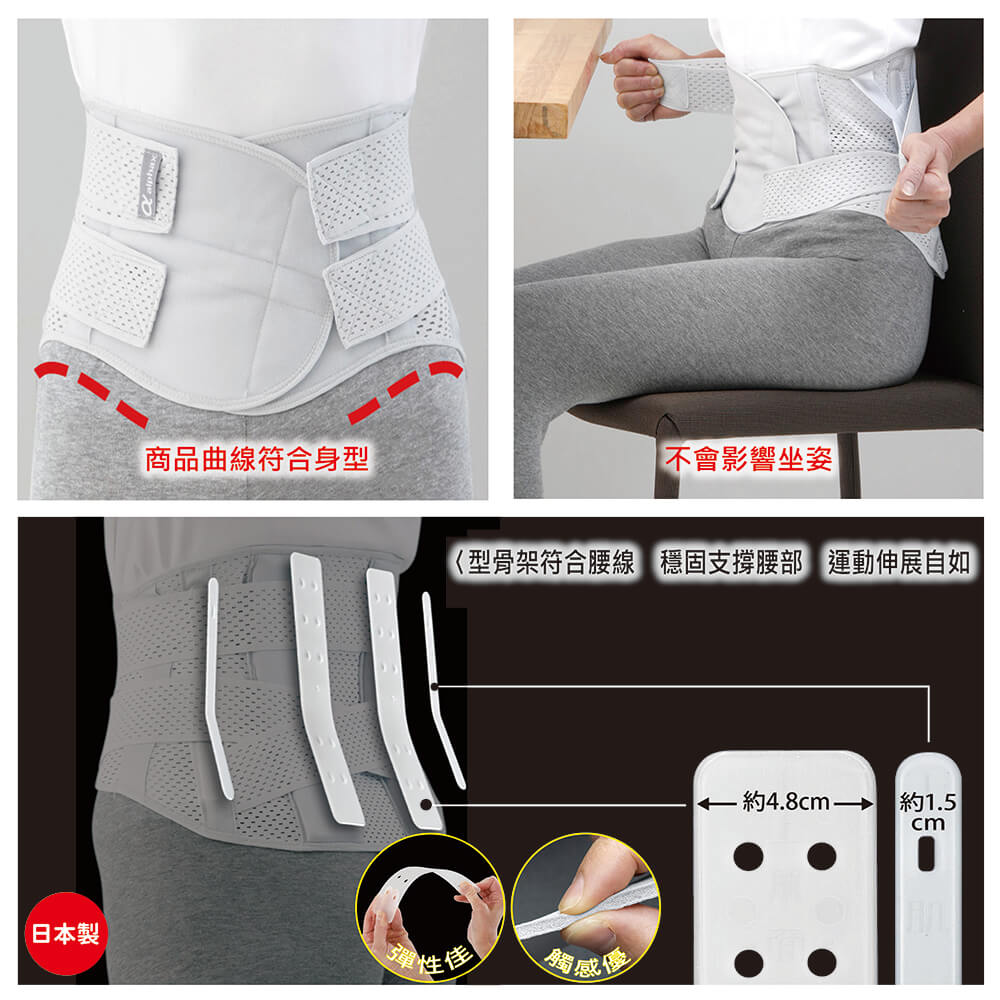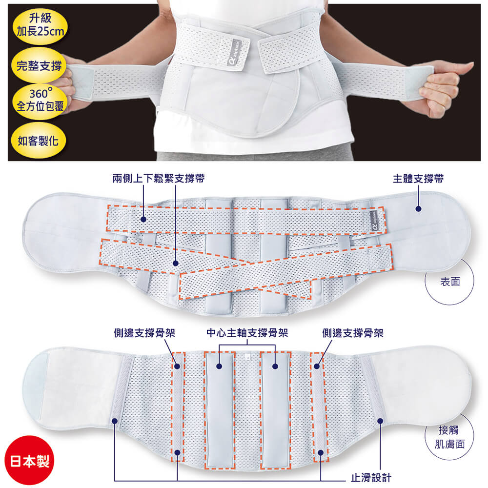 有如客製化商品打造最佳效果與高品質的腰椎護具。寬幅符合身型完整支撐腰椎與骨盆。主體與兩側上下腰帶可以獨立調整鬆緊度達到舒適貼合感。腰部升級加長25cm,360°全方位立體包覆,穩固支撐腰部/下背部。腹部無壓迫感,不會妨礙坐姿、運動伸展自如。透氣乾爽彈性佳、耐用度高,一年四季皆適。