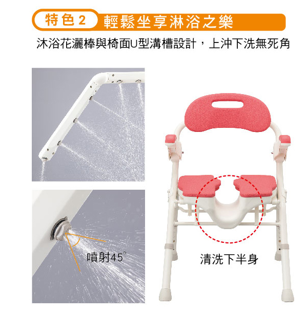 樂齡網推薦【安壽】淋浴洗澡椅 536-30,不須特殊裝置,直接接上蓮蓬頭軟管,就能坐在洗澡椅上享受淋浴,搭配椅面U型溝槽設計,上沖下洗無死角。可折疊收納,不占浴室空間,讓您家的長輩可以既安全又舒適地洗澡。