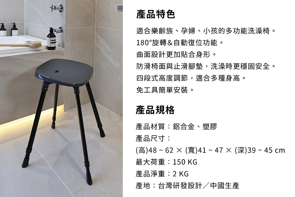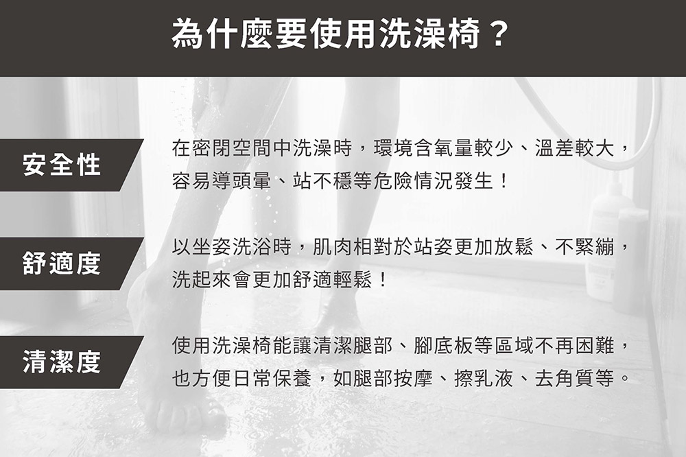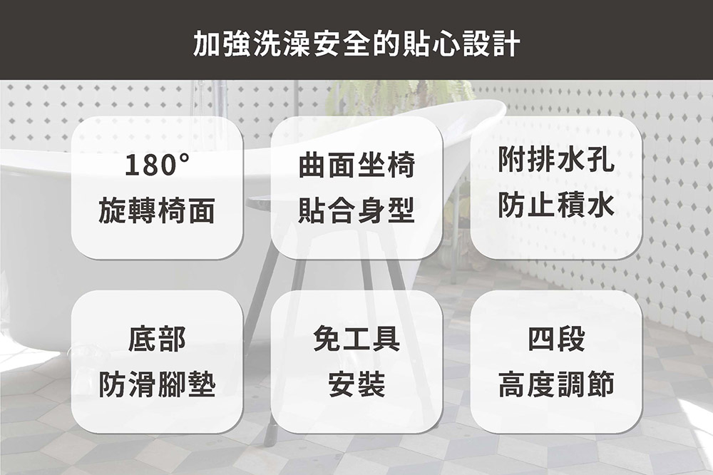 體貼您的長輩,為他準備一個可以坐著洗澡的椅子,安全又舒服。您的用心,會讓他更安心。