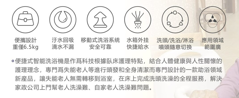 2. 節省傳統幫受照者淋浴的預前準備和浴後收拾的時間,可節省10分鐘以上。