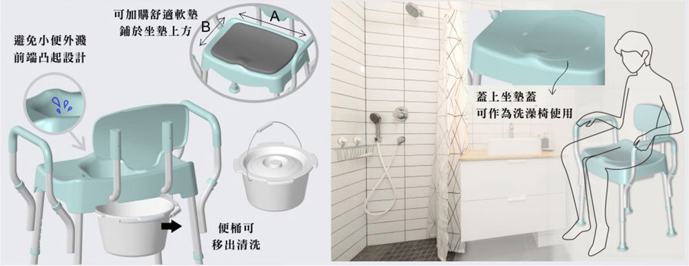高機動性,提供銀髮長輩及行動不便人士,作為臨時廁所,便桶可移出清洗