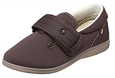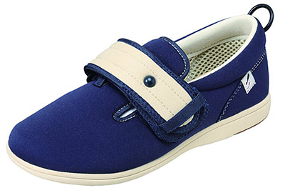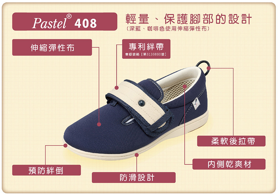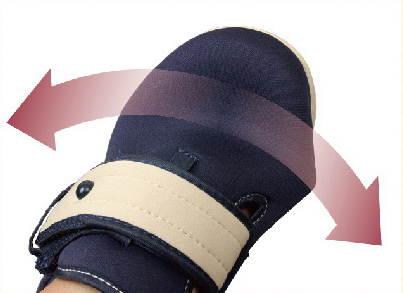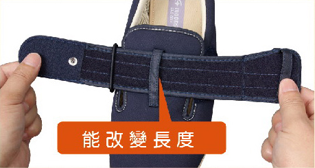 使用伸縮性佳的彈性布料,搭配專利絆帶設計,可依個人調整至合腳,讓腳容易浮腫的長者也能穿得舒服;鞋前端底部微翹、避免絆倒,無論是復健、室內、室外都適合穿,處處皆是無微不至的貼心設計。