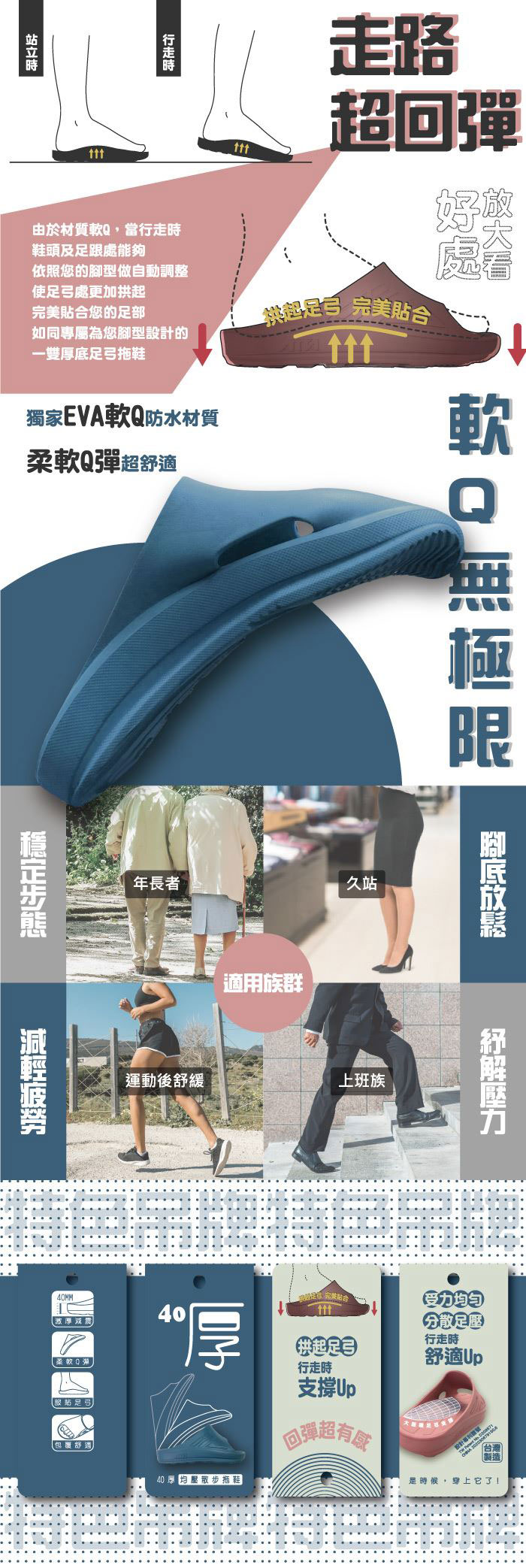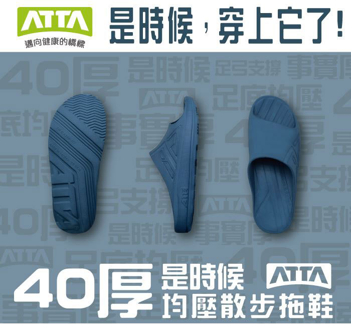 是時候,穿上它了!【ATTA】40厚 均壓散步拖鞋,40mm激厚,減震效果加倍,走起路來超安穩、材質軟Q,行走時鞋頭及足跟處能夠依照您的腳型做自動調整,使足弓處更加拱起,完美貼合您的足部,如同專屬為您腳型設計的一雙厚底足弓拖鞋!