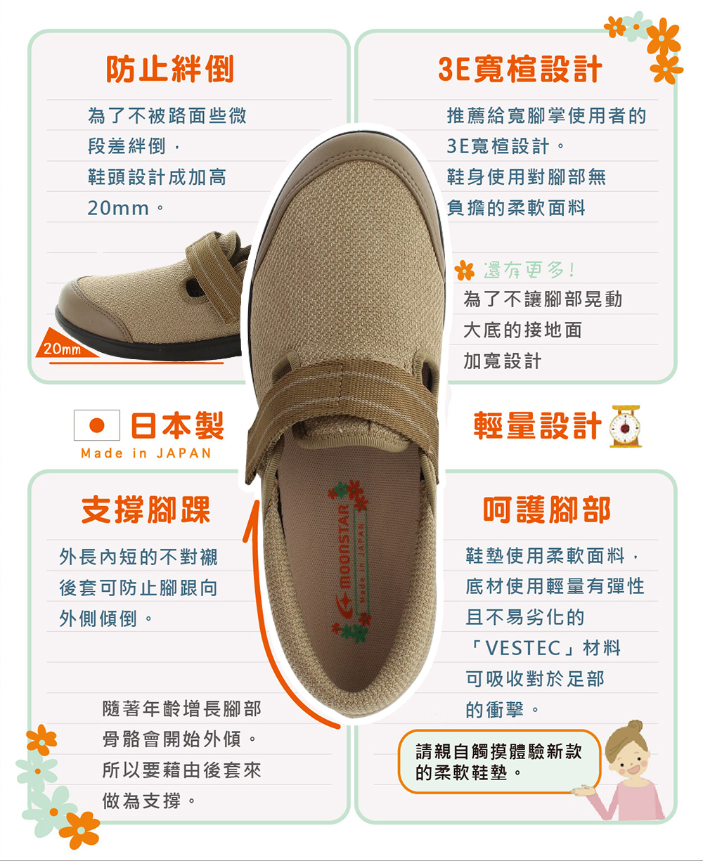 日本鞋大廠【MoonStar】出品的樂活休閒鞋,3E楦頭適合寬腳掌者、鞋身採用柔軟舒適面料、輕量化設計無負擔,鞋墊有彈性可吸收足部衝擊、後套設計可有效支撐,防止腳跟向外傾倒,是喜愛趴趴走的熟年女性必備鞋款。