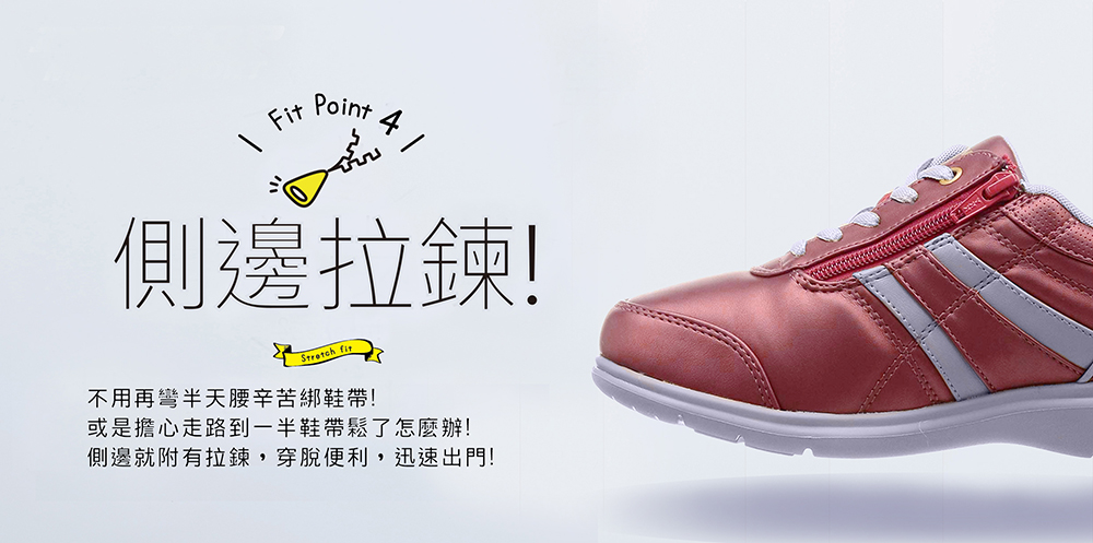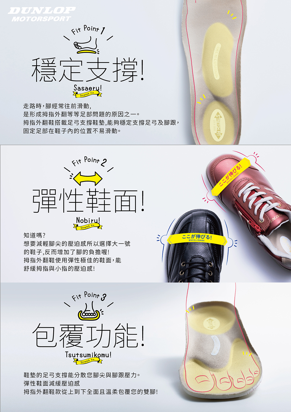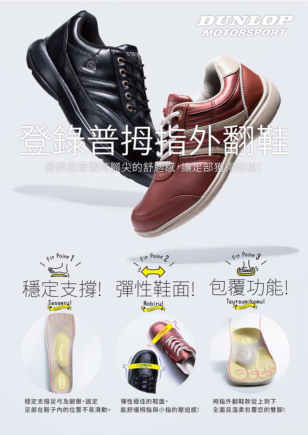 日本熟年鞋品牌DUNLOP,針對深受拇指外翻困擾的女性需求,特別設計此鞋款,可提升腳掌舒適度。彈性鞋面材質,減緩姆指與小指的壓迫感;鞋墊的足弓支撐設計,可避免腳掌往前滑動,減輕擠壓所帶來的不適;簡約的外型設計,更是吸引熟齡女性選擇這鞋款的原因!
