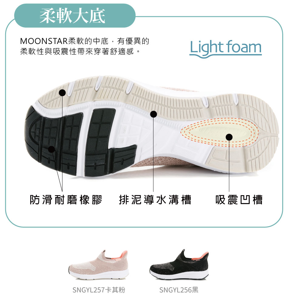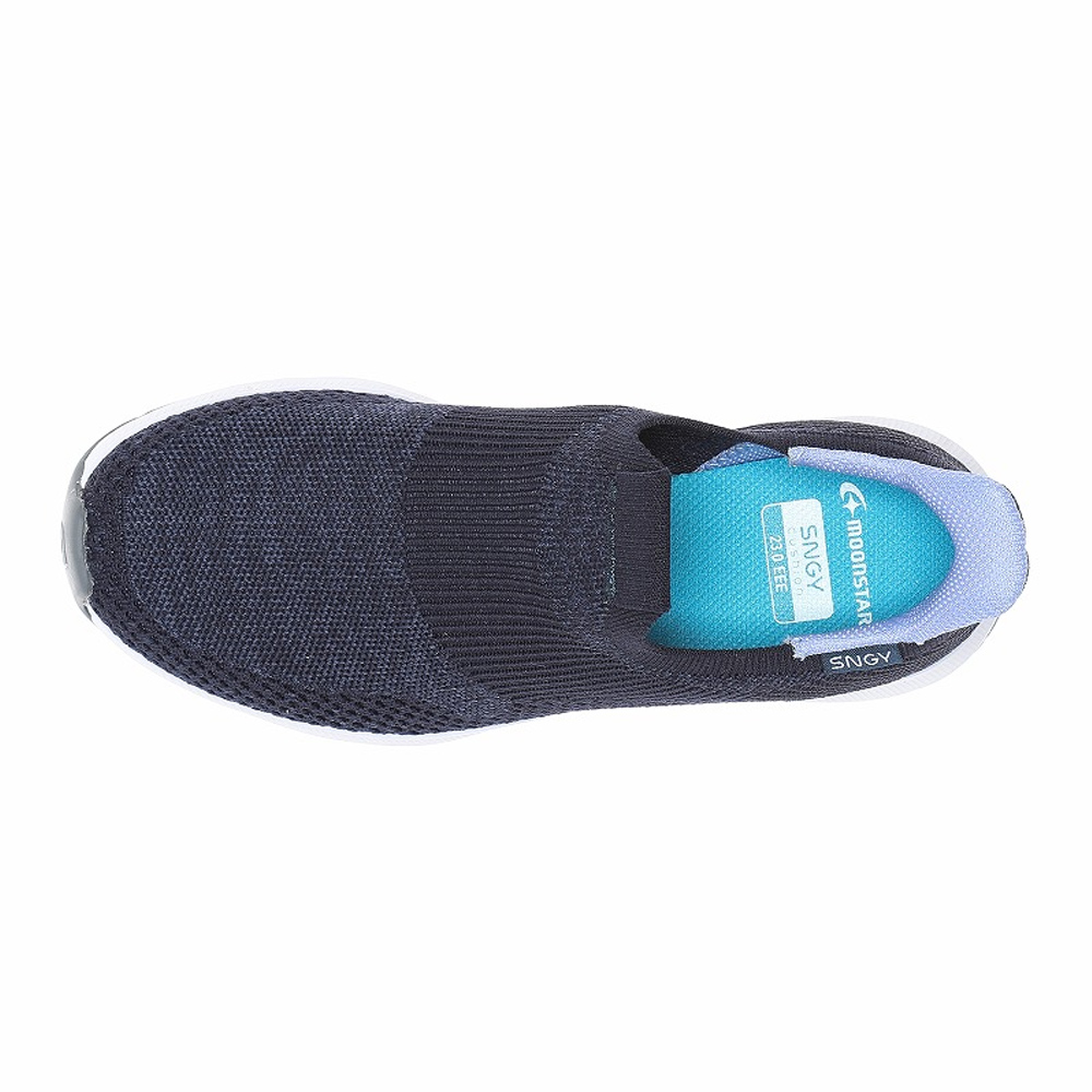 這是 Moonstar 的女士運動鞋,屬於兼具輕盈、柔軟及卓越緩震性的 SNGYcushion(協同緩震)系列。鞋款採用針織鞋面,能與雙足完美貼合且具備良好的透氣性,採用容易穿脫的懶人鞋(Slip-on)設計。