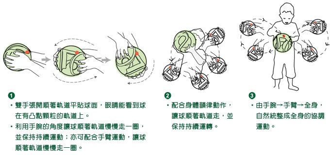 4. 球中球的設計概念, 讓雙手握球運轉, 控制球在軌道中持續滾動。