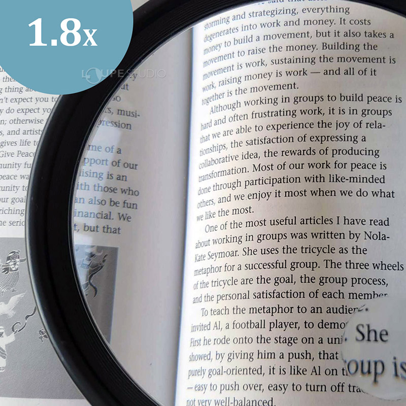 大鏡片倍率為1.8倍(為保持視野寬廣跟清晰,所搭配最適合讀書等活動使用的倍率)