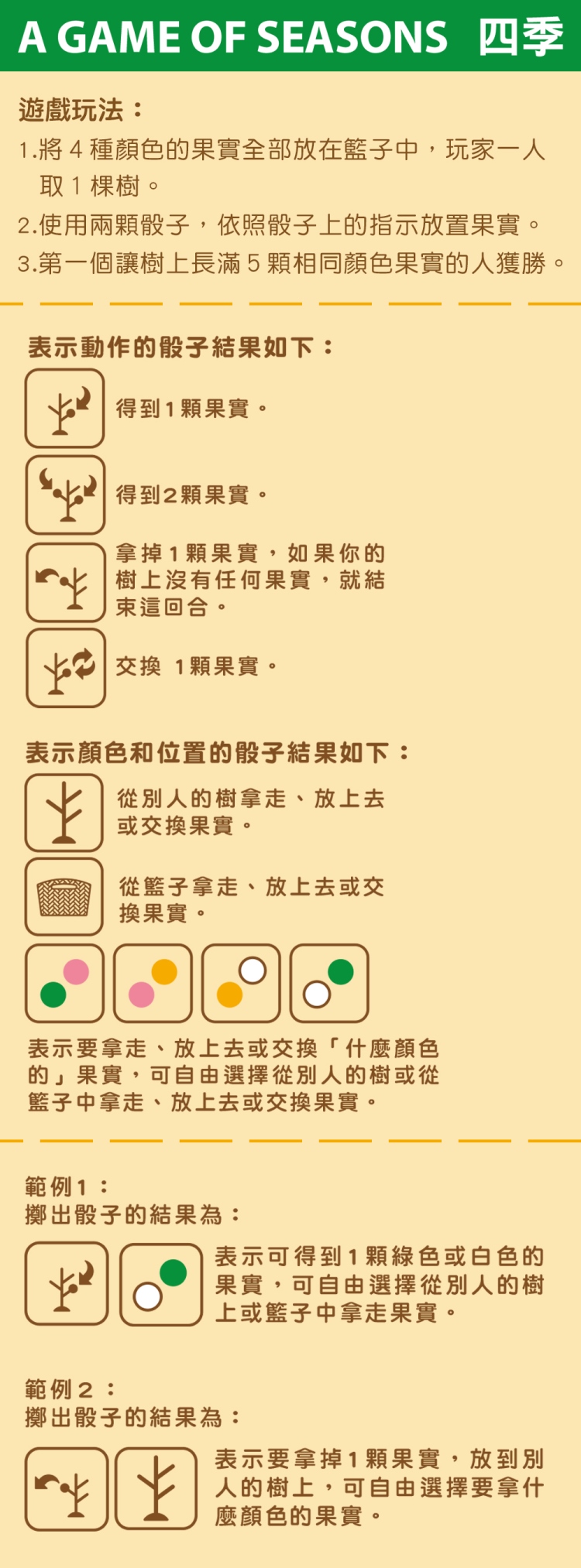 發想自大自然的四季,設計成四種顏色的樹,粉紅色代表春天,綠色代表夏天,橘色代表秋天,白色代表冬天。搭配兩種特殊骰子,一種指定顏色和位置,一種指定動作,玩家一人取一棵光禿禿的樹,必須根據骰子的結果拿取指定顏色或位置的果實,並將果實放到指定的位置,最先為自己的樹蒐集滿5顆相同顏色的果實的人就贏了!