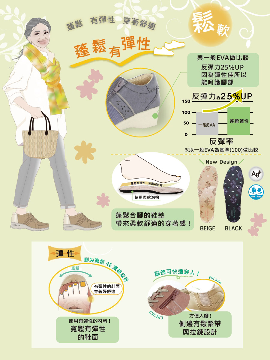日本熟齡鞋大廠【Moonstar】設計,主打穿著舒適的「Moonstar Eve」鞋款,使用延展性高、彈性柔軟的素材,製成具良好緩衝性的鞋底和鞋墊。外側為拉鍊設計,穿脫都很方便。